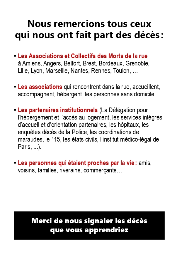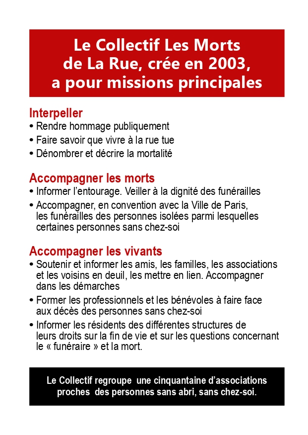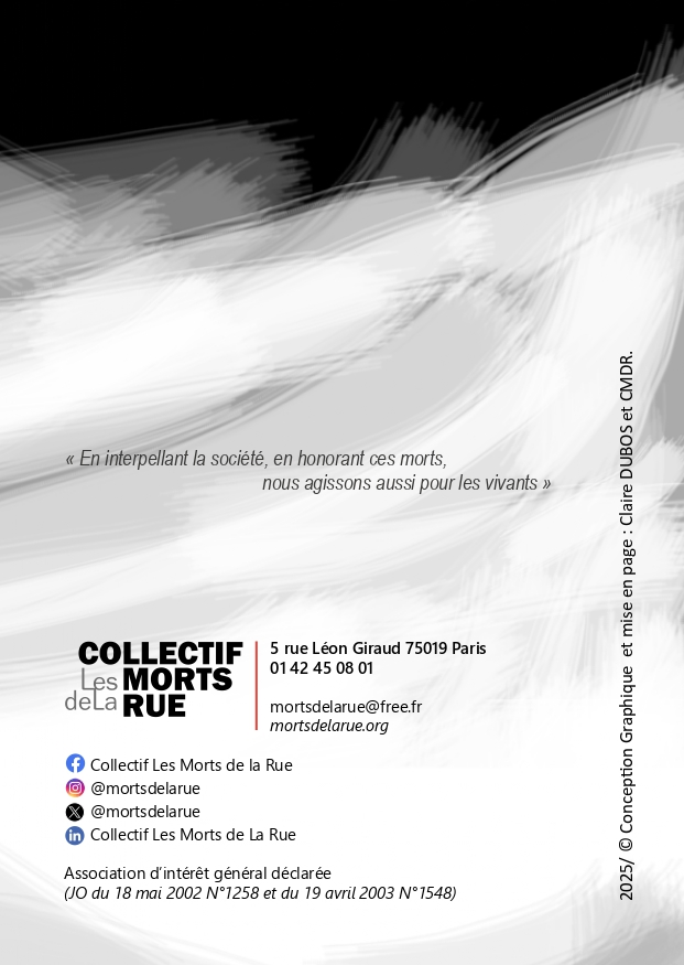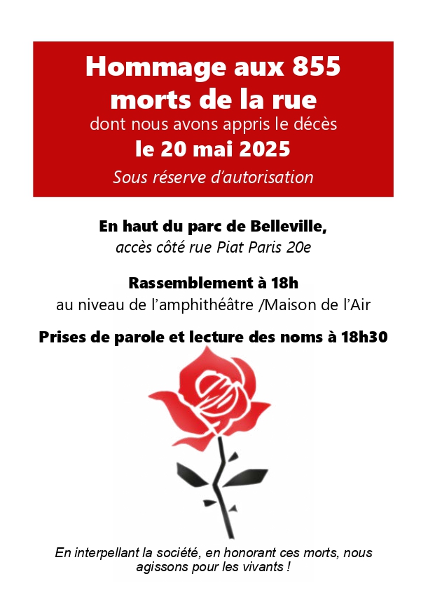 Le 20 mai 2025 à 18h00 à Paris 18e, un hommage sera rendu aux 855 morts de la rue dont le décès a été appris en 2024 par le « Collectif des Morts de la Rue »