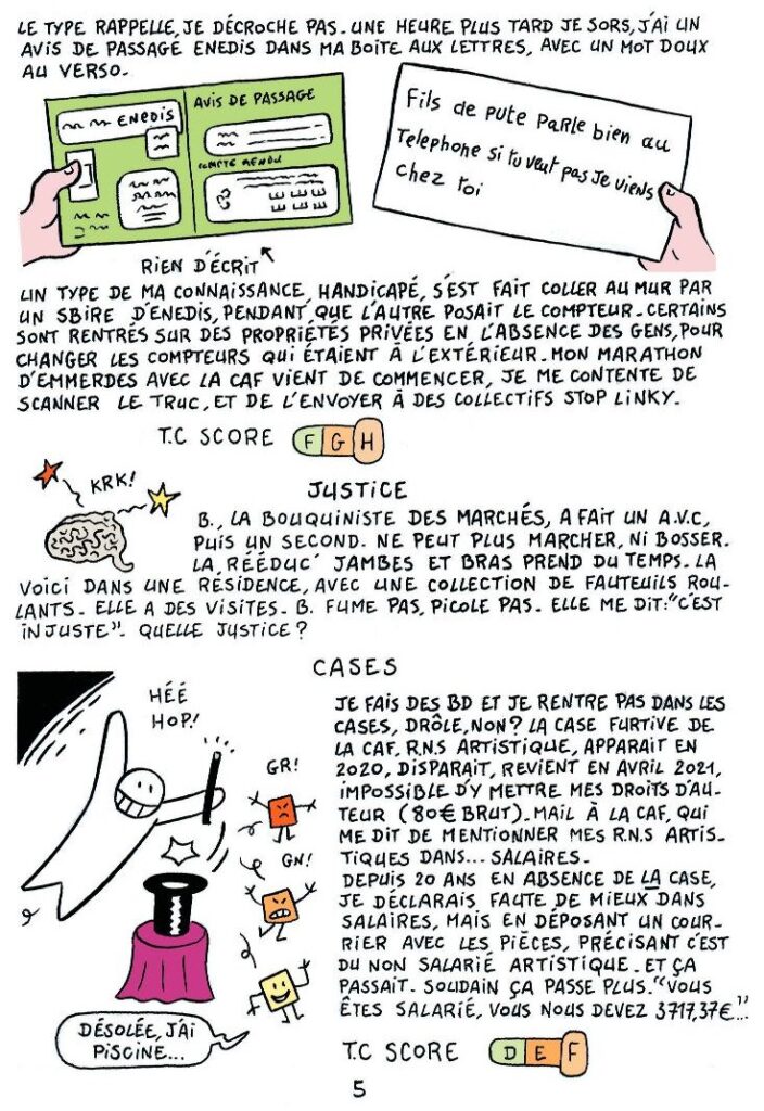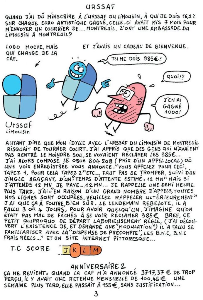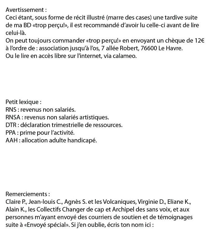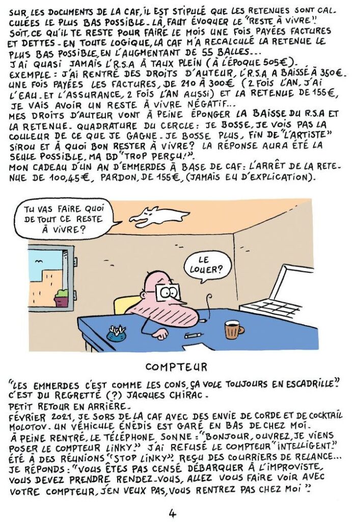Les Sans-Voix s’expriment de multiples manières : le texte, le son, la vidéo, le dessin, la peinture, la musique, le chant, et tant d’autres moyens encore. Certains combinent des talents. C’est le cas de Jérôme SIROU qui est l’auteur de 2 bandes-dessinées intitulées « Trop-perçu » & « Cordialement ». Il y raconte un indu de plus de 3717€ à rembourser à la CAF après le célèbre « recalcul des droits » parce qu’il est considéré comme salarié alors qu’il est en réalité artiste auteur, les prélèvements sur ses prestations qui le plongent littéralement dans la précarité (de cette précarité où l’on ignore comment on mangera le lendemain), les galères pour se faire entendre, la bataille avec le système informatique, …