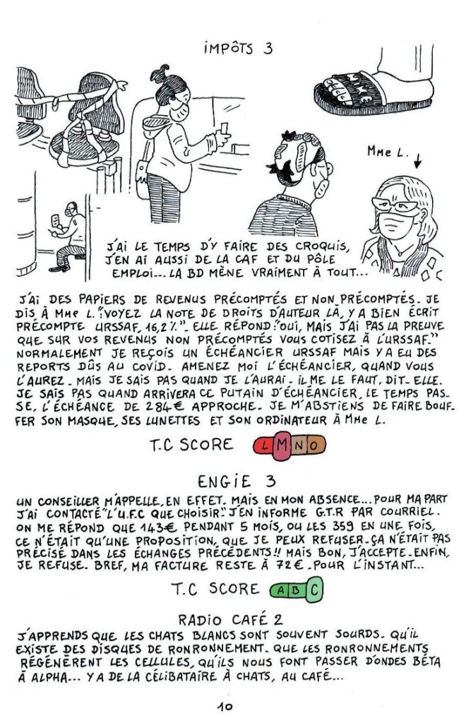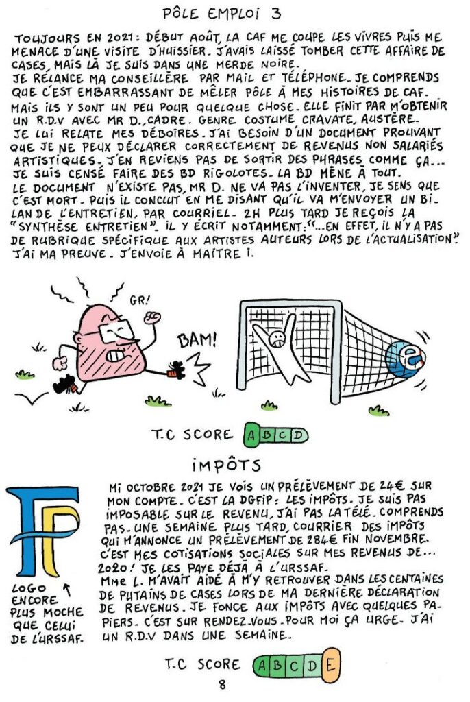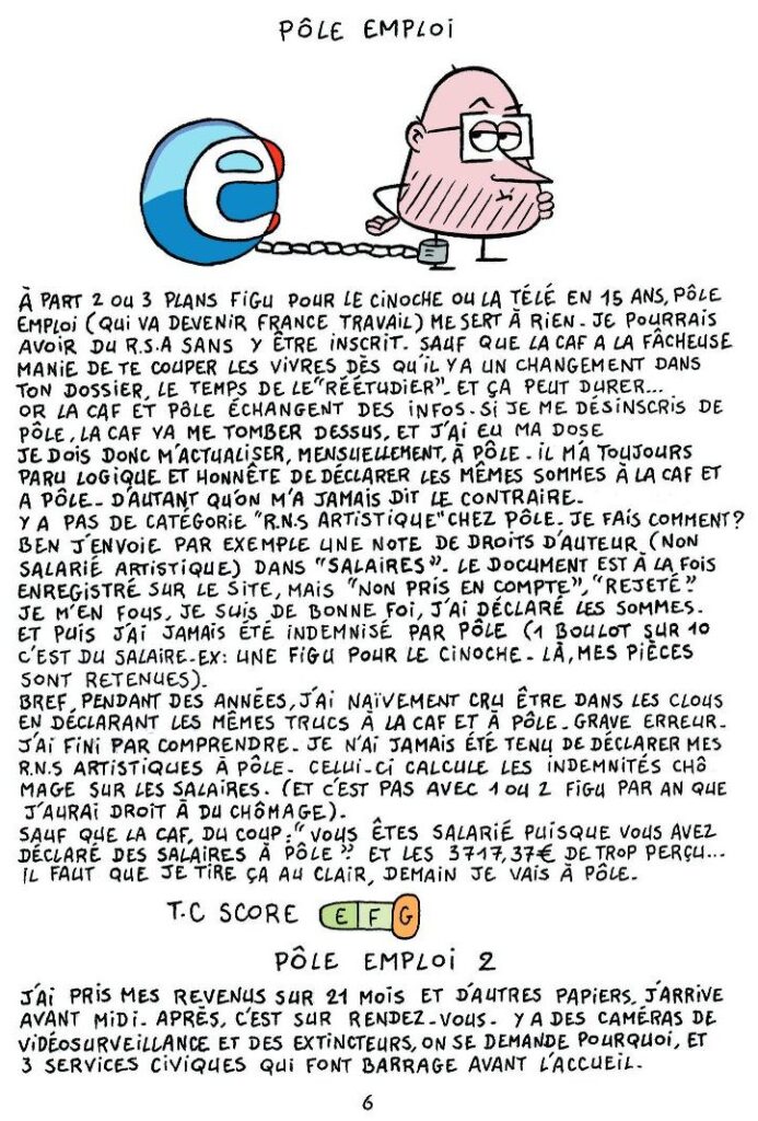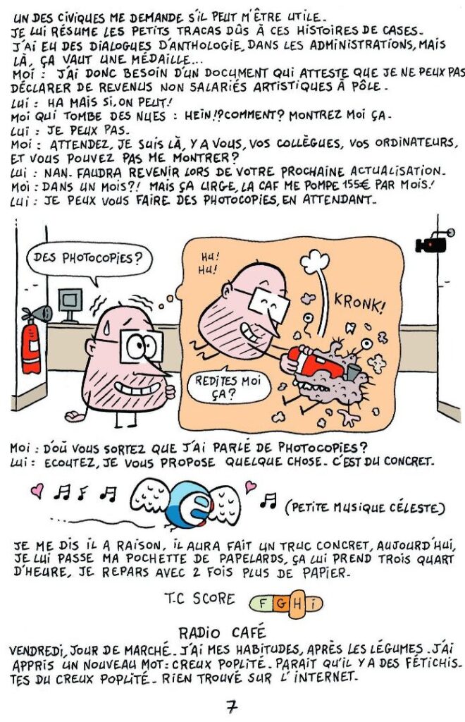Les Sans-Voix s’expriment de multiples manières : le texte, le son, la vidéo, le dessin, la peinture, la musique, le chant, et tant d’autres moyens encore. Certains combinent des talents. C’est le cas de Jérôme SIROU qui est l’auteur de 2 bandes-dessinées intitulées « Trop-perçu » & « Cordialement ». Il y raconte un indu de plus de 3717€ à rembourser à la CAF après le célèbre « recalcul des droits » parce qu’il est considéré comme salarié alors qu’il est en réalité artiste auteur, les prélèvements sur ses prestations qui le plongent littéralement dans la précarité (de cette précarité où l’on ignore comment on mangera le lendemain), les galères pour se faire entendre, la bataille avec le système informatique, …