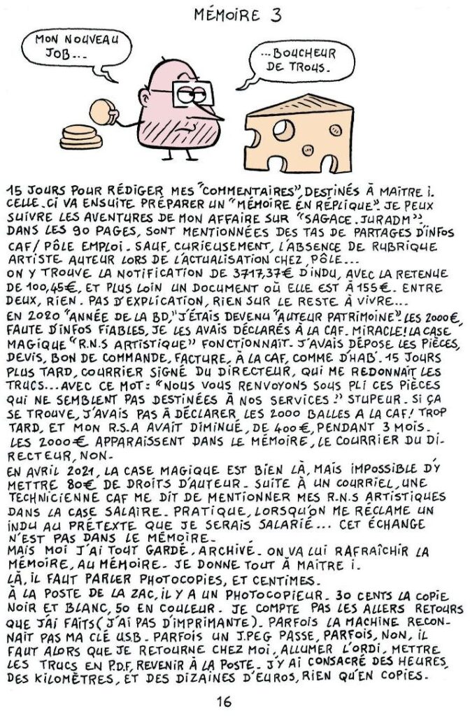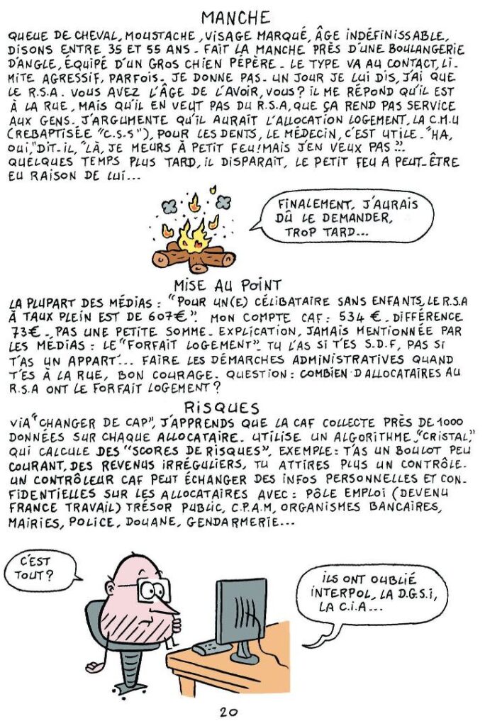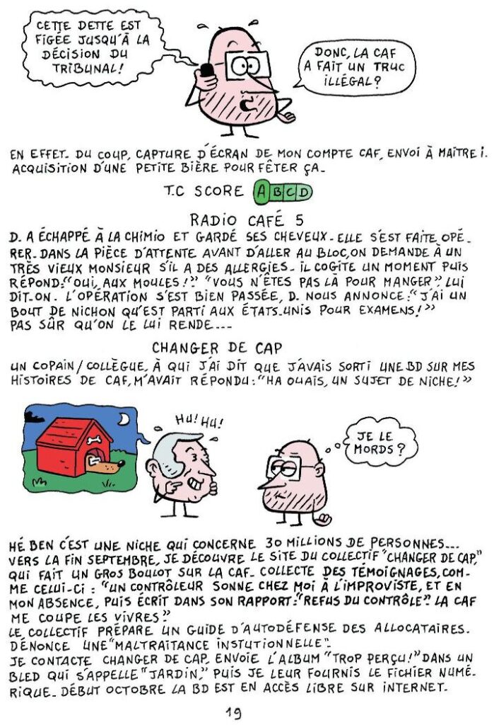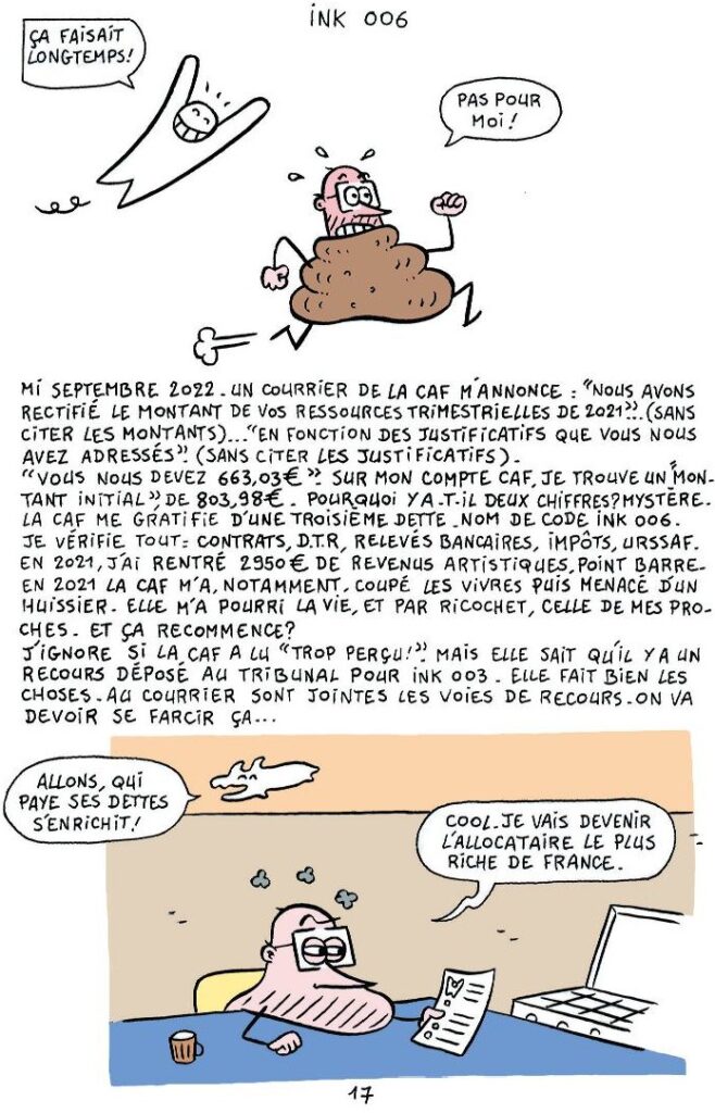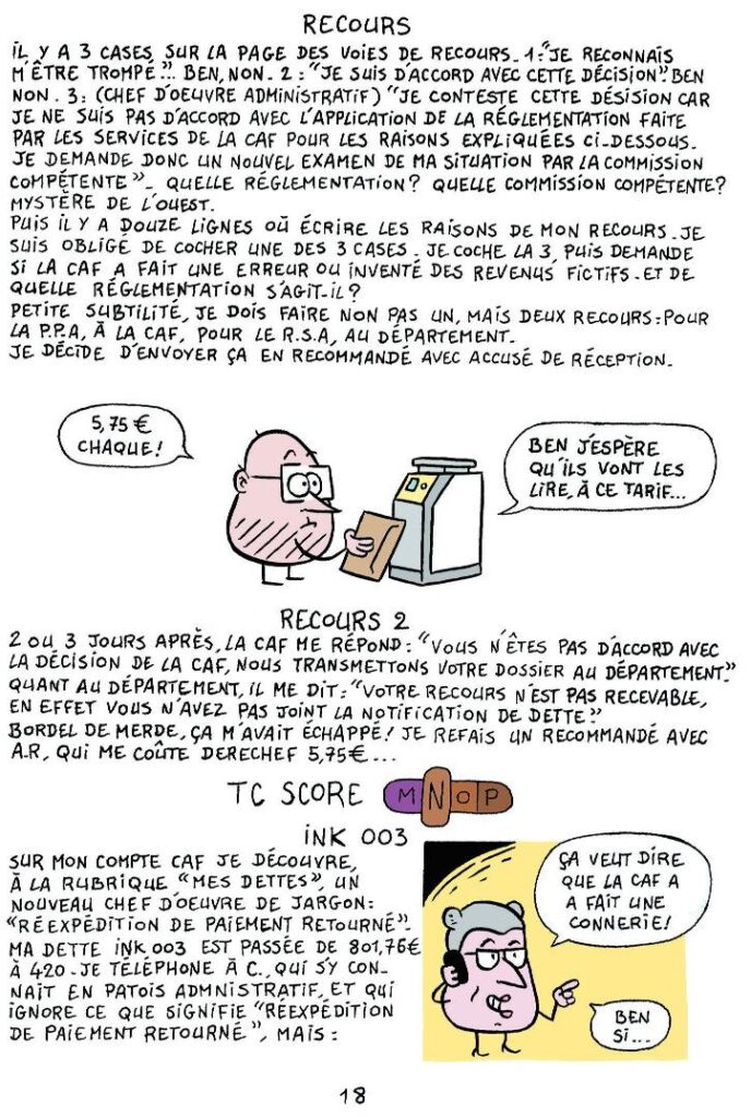 Les Sans-Voix s’expriment de multiples manières : le texte, le son, la vidéo, le dessin, la peinture, la musique, le chant, et tant d’autres moyens encore. Certains combinent des talents. C’est le cas de Jérôme SIROU qui est l’auteur de 2 bandes-dessinées intitulées « Trop-perçu » & « Cordialement ». Il y raconte un indu de plus de 3717€ à rembourser à la CAF après le célèbre « recalcul des droits » parce qu’il est considéré comme salarié alors qu’il est en réalité artiste auteur, les prélèvements sur ses prestations qui le plongent littéralement dans la précarité (de cette précarité où l’on ignore comment on mangera le lendemain), les galères pour se faire entendre, la bataille avec le système informatique, …