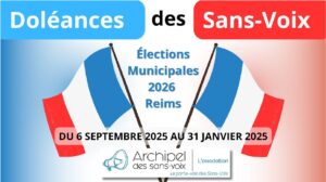 A l’initiative du Groupe Local ADSV Champagne Ardenne, un projet se met en place à Reims. L’Archipel des Sans Voix se fera l’écho des personnes en grande difficulté d’expression, n’osant pas ou ne pouvant pas s’exprimer en public. Ce projet de « Doléances des Sans-Voix » leur permettra de participer ainsi aux Elections Municipales en leur qualité de citoyen-ne(s) et de faire entendre leur voix auprès des candidats en lice.