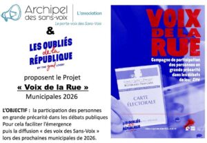 A l’initiative et sous les hospices du collectif « Les Oubliés de la République » auquel adhère l’Archipel des Sans-Voix, une démarche intitulée « Voix de la Rue » vise à permettre la participation de personnes en grande précarité dans les débats publiques à l’occasion des élections municipales 2026.