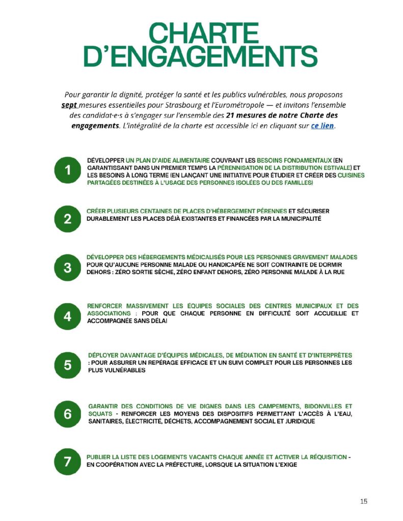 Une « charte d’engagements » de 23 propositions d’actions concrètes à mener lors de la prochaine mandature leur a été proposée pour une acception formelle (totale ou partielle) de leur part. Les engagements pris -ou non- par les listes sollicitées seront rendus public prochainement pour éclairer les électeurs mobilisés sur ces sujets.